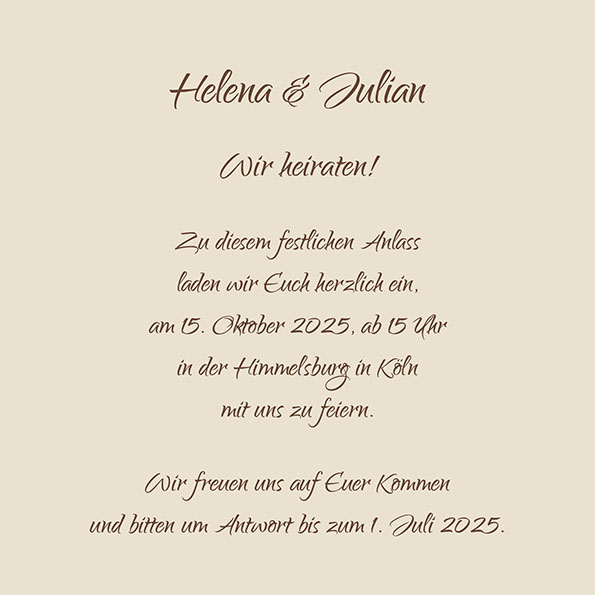 Die Texte werden von unseren Profis passend zur Karte in Form gebracht. In Kürze erhaltet Ihr noch vor Druckbeginn per E-Mail eine PDF-Datei zur Ansicht. Hier ist die Karte zu sehen, wie sie bedruckt aussehen wird. Natürlich könnt Ihr dann an Euren Texten noch Änderungen vornehmen lassen – ohne Aufpreis.