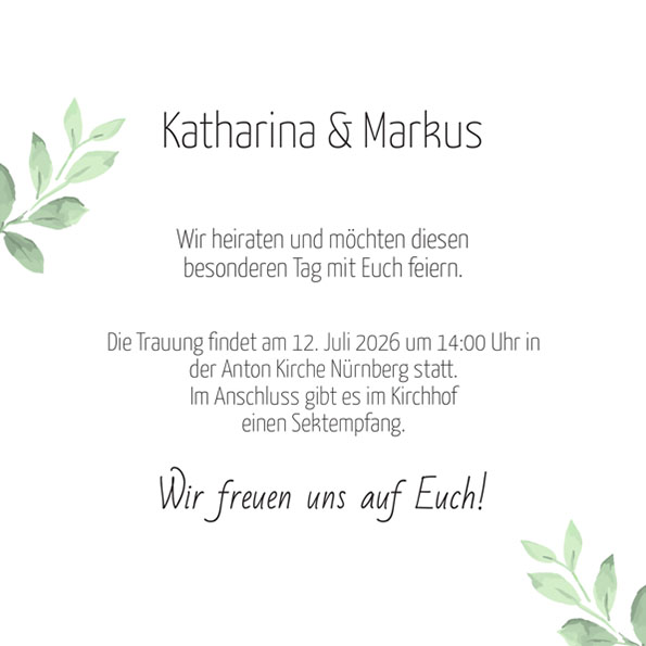 Die Texte werden von unseren Profis passend zur Karte in Form gebracht. In Kürze erhaltet Ihr noch vor Druckbeginn per E-Mail eine PDF-Datei zur Ansicht. Hier ist die Karte zu sehen, wie sie bedruckt aussehen wird. Natürlich könnt Ihr dann an Euren Texten noch Änderungen vornehmen lassen – ohne Aufpreis.